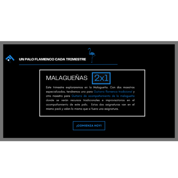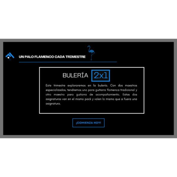 Cada trimestre exploraremos juntos un nuevo palo flamenco de la mano de dos maestros de distintas disciplinas de la guitarra flamenca. El pack por tanto incluye dos asignaturas por el precio de una. Y cada trimestre además de cambiar de palo flamenco rotará la asignatura complementaria: Improvisación en los palos flamencos, Acompañamiento al cante, Identificación e historia de los cantes flamencos